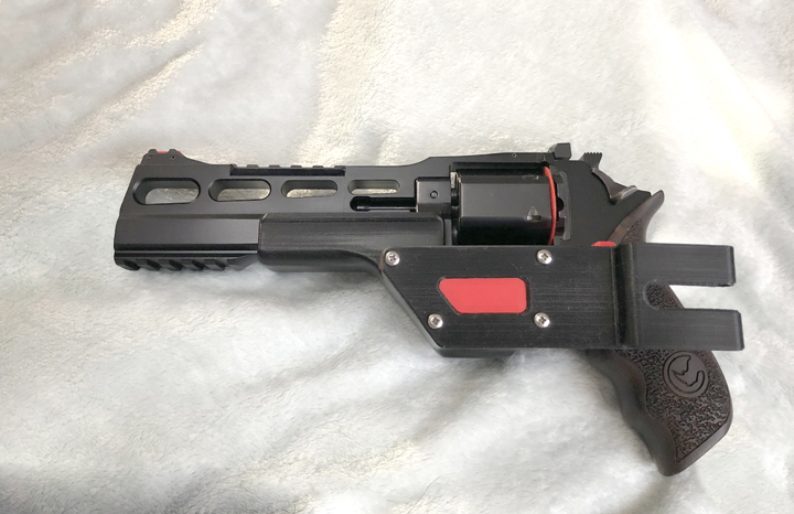 We designed a competition holster for a UK shooter who wanted to try his Chiappa Rhino in an upcoming timed and precision handgun competition. In the UK, firearms legislation requires revolvers of this type to have barrel and stock extensions, presumably so they are not easily carried. The shooter had tried other holsters and wanted a holster that offered greater safety out on the range. The shooter required the revolver to have a totally closed off the trigger and to be secured in-holster with a mechanical interlock.