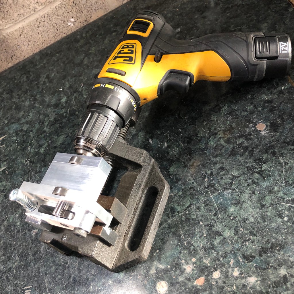 The de-crimper automatically feeds and ejects the case by adjusting the angle at which the case is engaged onto the mandrel. The next step is to add a power unit similar to that used on the power neck turner.