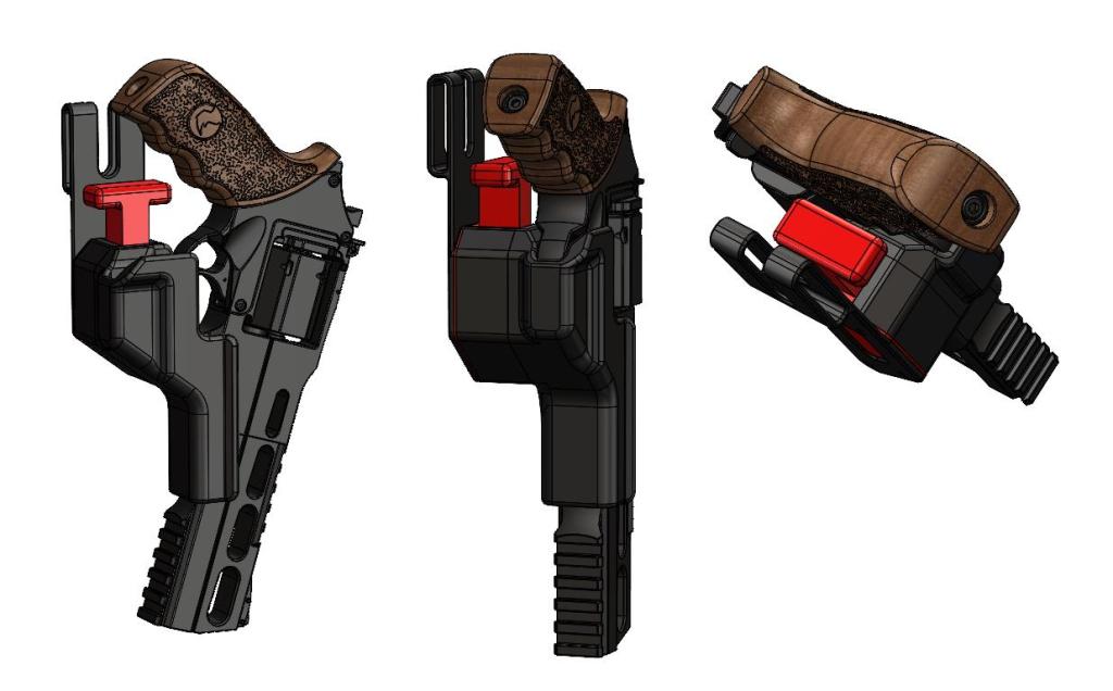 Several prototypes and range day tests with 3D printed prototypes refined the design to create a slick and secure holster that the revolver cannot be accidentally disengaged from.