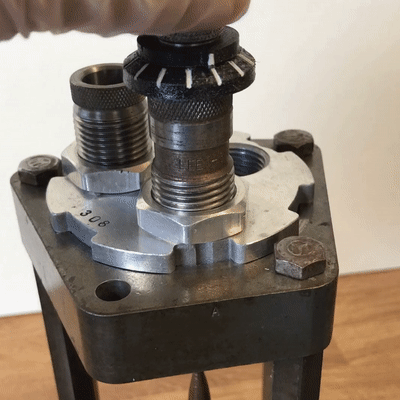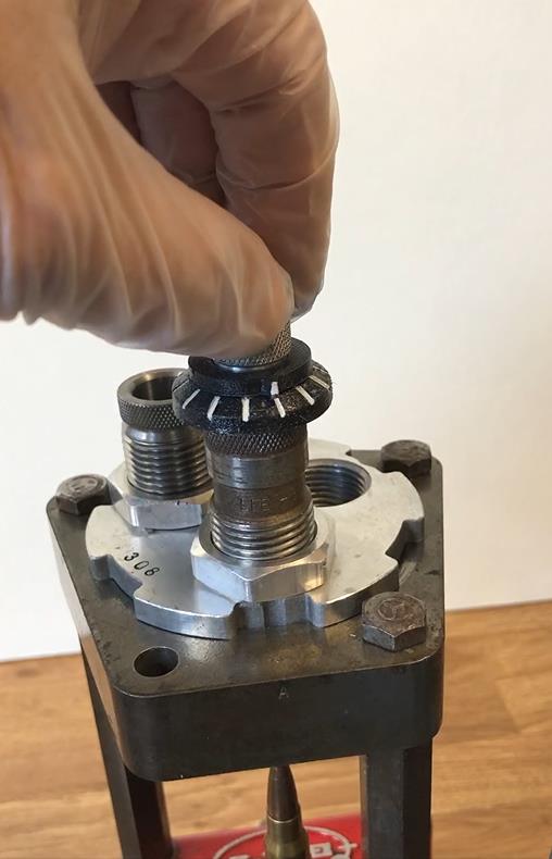 Adjusting the bullet seating depth can be trial and error with a non micrometer adjustable die set such as these dies. These dies could be better by adding a scale ring where the ring corresponds to the thread pitch. In this instance one increment = 0.1mm The clip on ring with pointer allows the reloader to zero at any time.