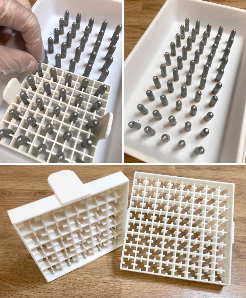 A few of us have our own magic formula for bullet lube and we pan lube our bullets to avoid having to set up the lubrisizing dies or press. Setting out the bullets in the pan while wearing gloves often ends up with knocking one over and then the domino effect takes over. We came up with a simple plastic frame to drop the bullets into and when filled the frame is lifted off leaving the bullets in place. Three different frames accommodate all the calibers from .22 up to .45. Just don’t knock the pan before you pour in the hot lube.